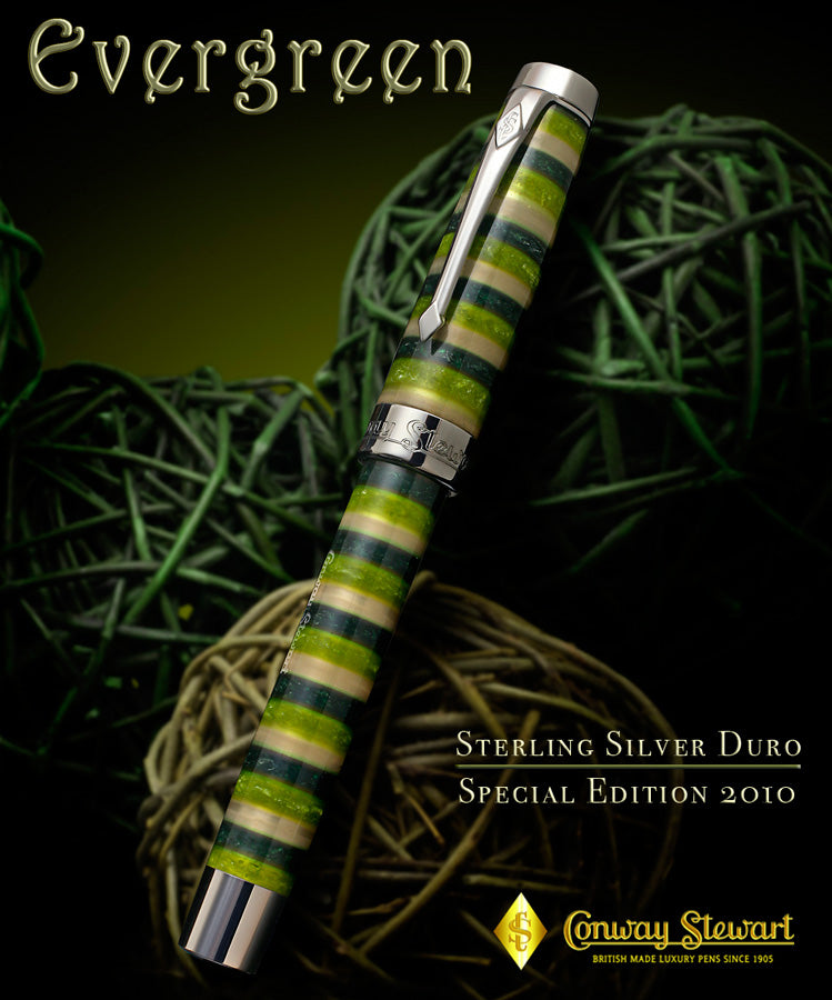 2010 年 2 月のスペシャル エディション — コンウェイ スチュワート エバーグリーンへようこそ。人気のスターリング シルバー デュロ モデルをベースにしたエバーグリーンは、新しい仕上げで、世界中で 50 個の番号付き筆記具でのみ入手可能です。