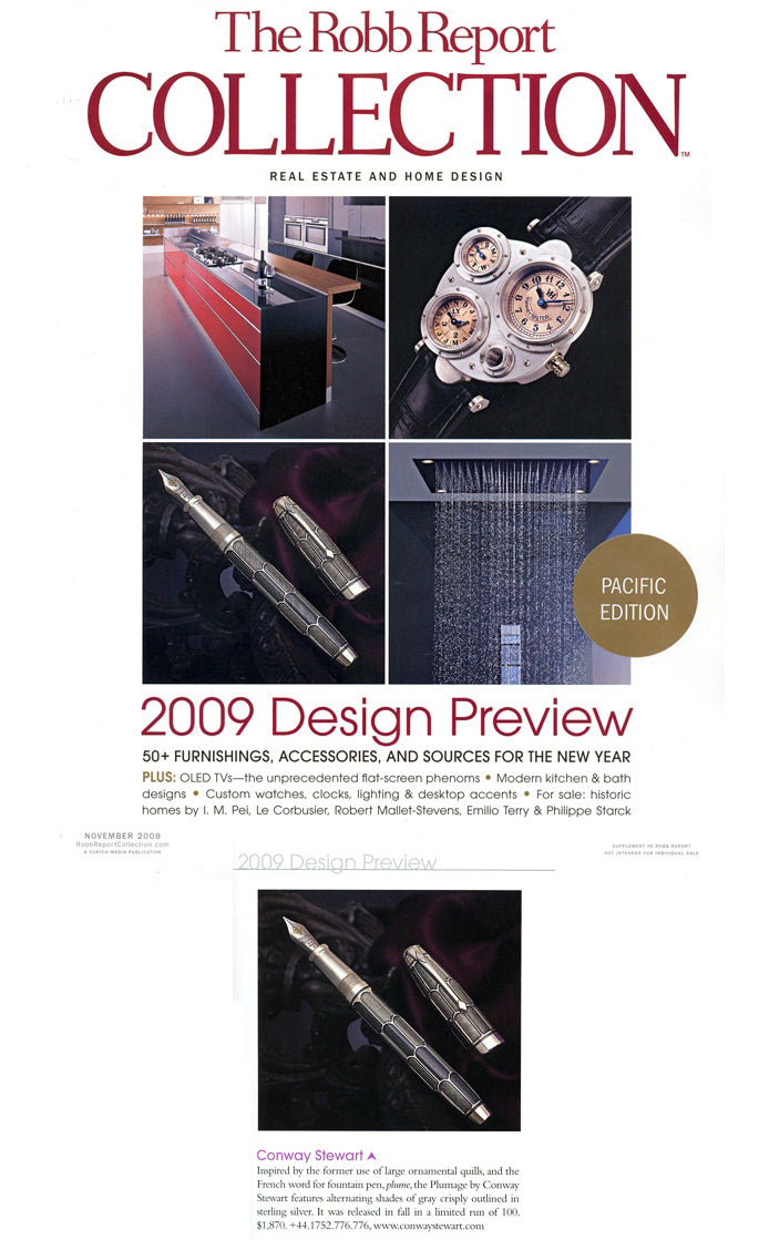 Inspiriert von der früheren Verwendung großer Zierfedern und dem französischen Wort für Füllfederhalter, Feder, Das Plumage von Conway Stewart zeichnet sich durch abwechselnde Grautöne aus, die klar in Sterlingsilber umrandet sind. Es wurde in einer limitierten Auflage von 100 Exemplaren herausgebracht. 1.870 $.