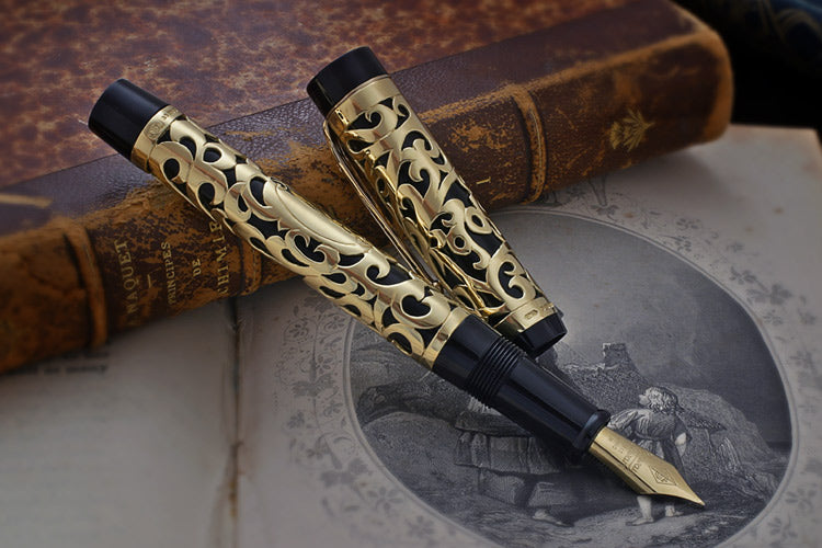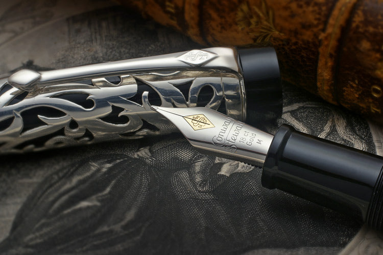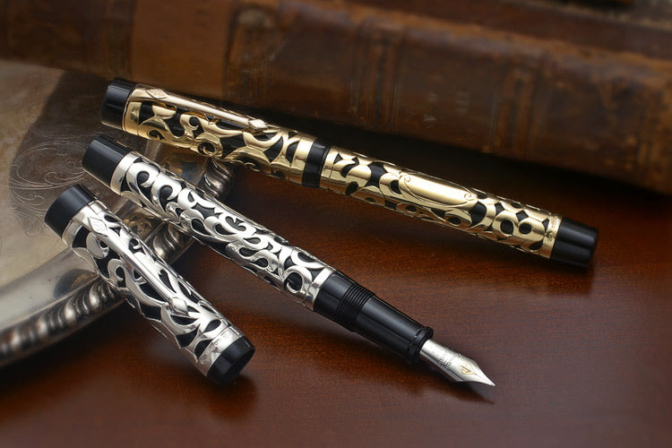Conway Stewart's latest Limited Edition is quite a departure for them. They have produced pens in solid gold prior to this, but this is the first time they have ventured into the production of a filigree overlay. The results would seem to prove that the attempt has been successful! One of several special pens being launched by Conway Stewart to celebrate the company's 100 year anniversary, the Centenary Overlay is a very striking pen, both in looks and "in the hand" presence.