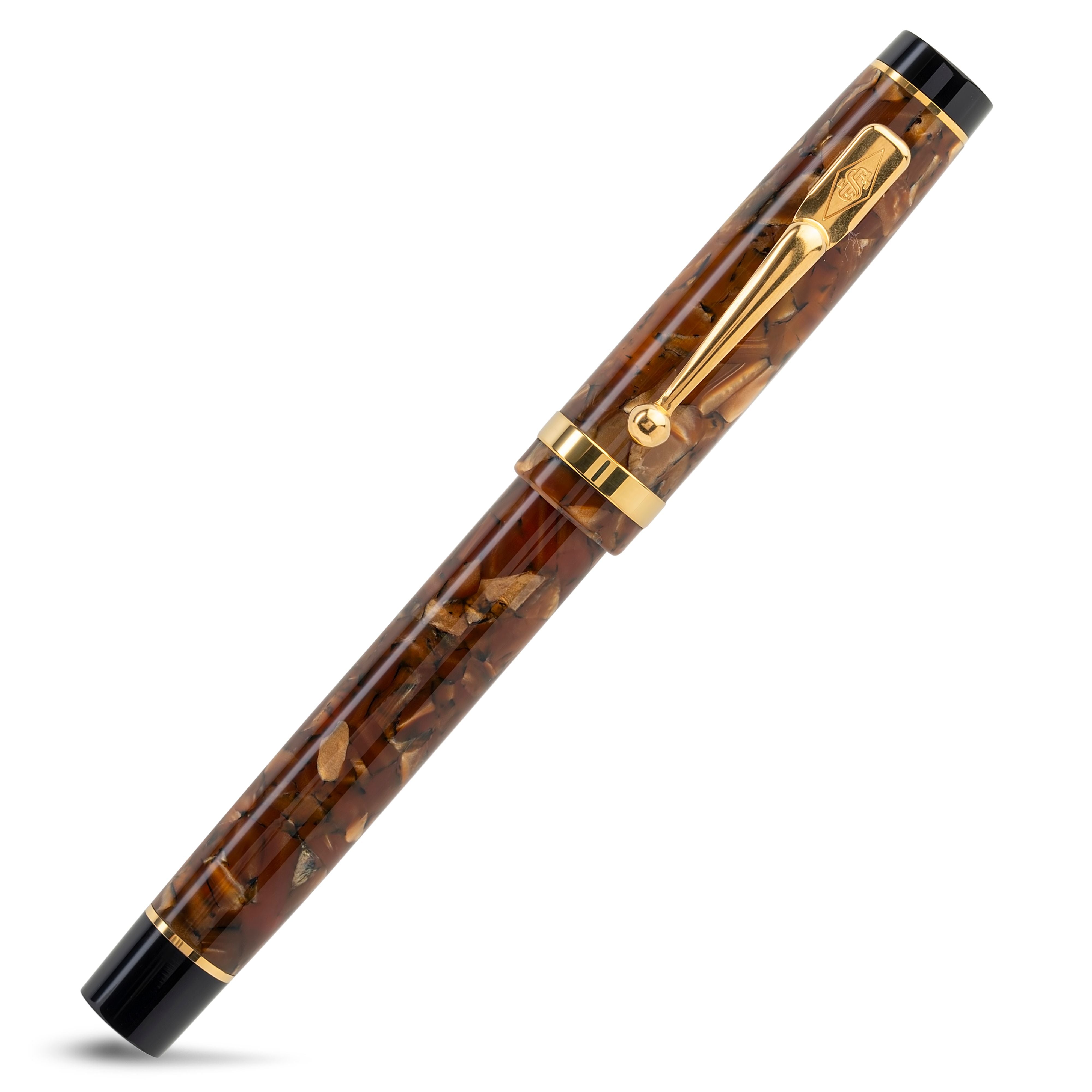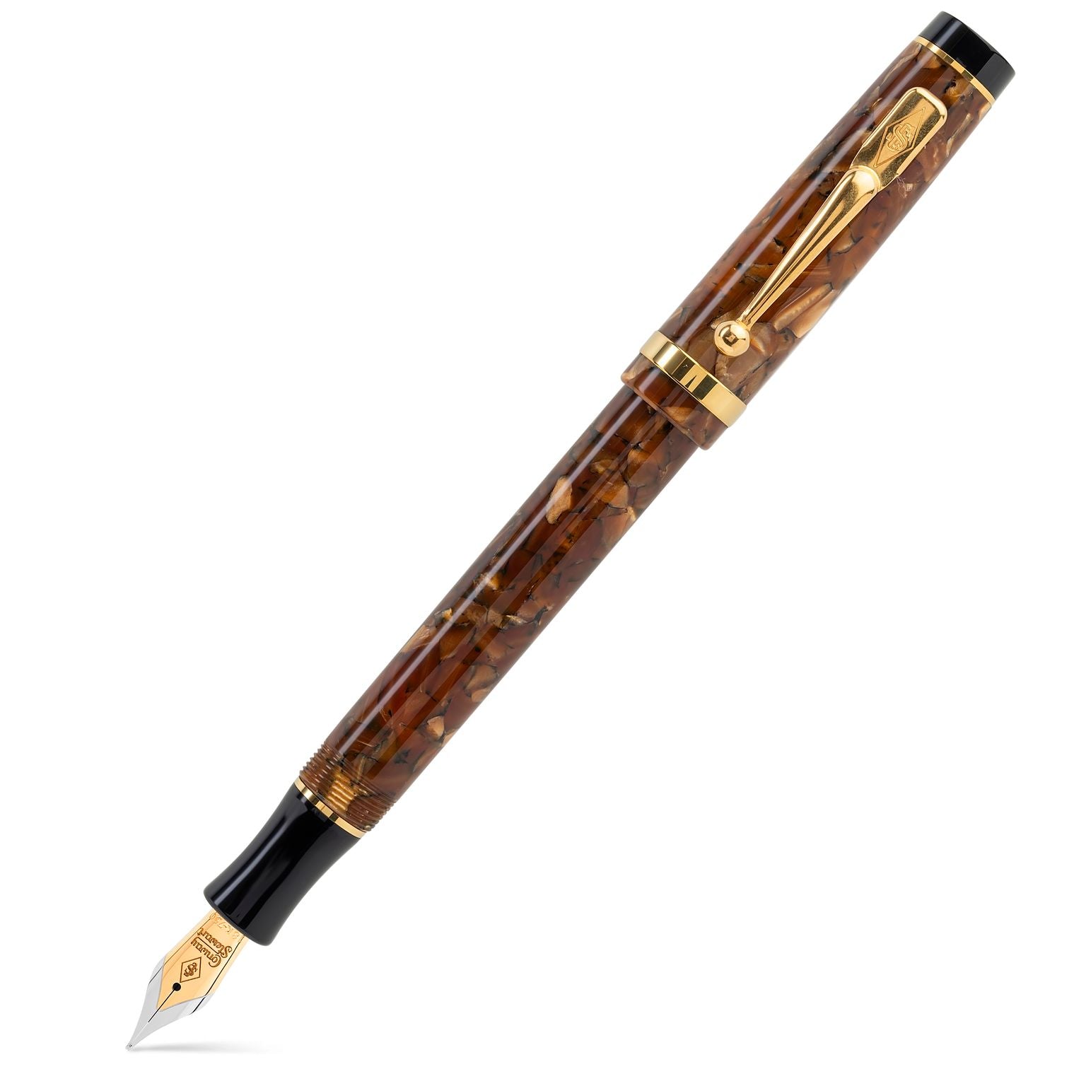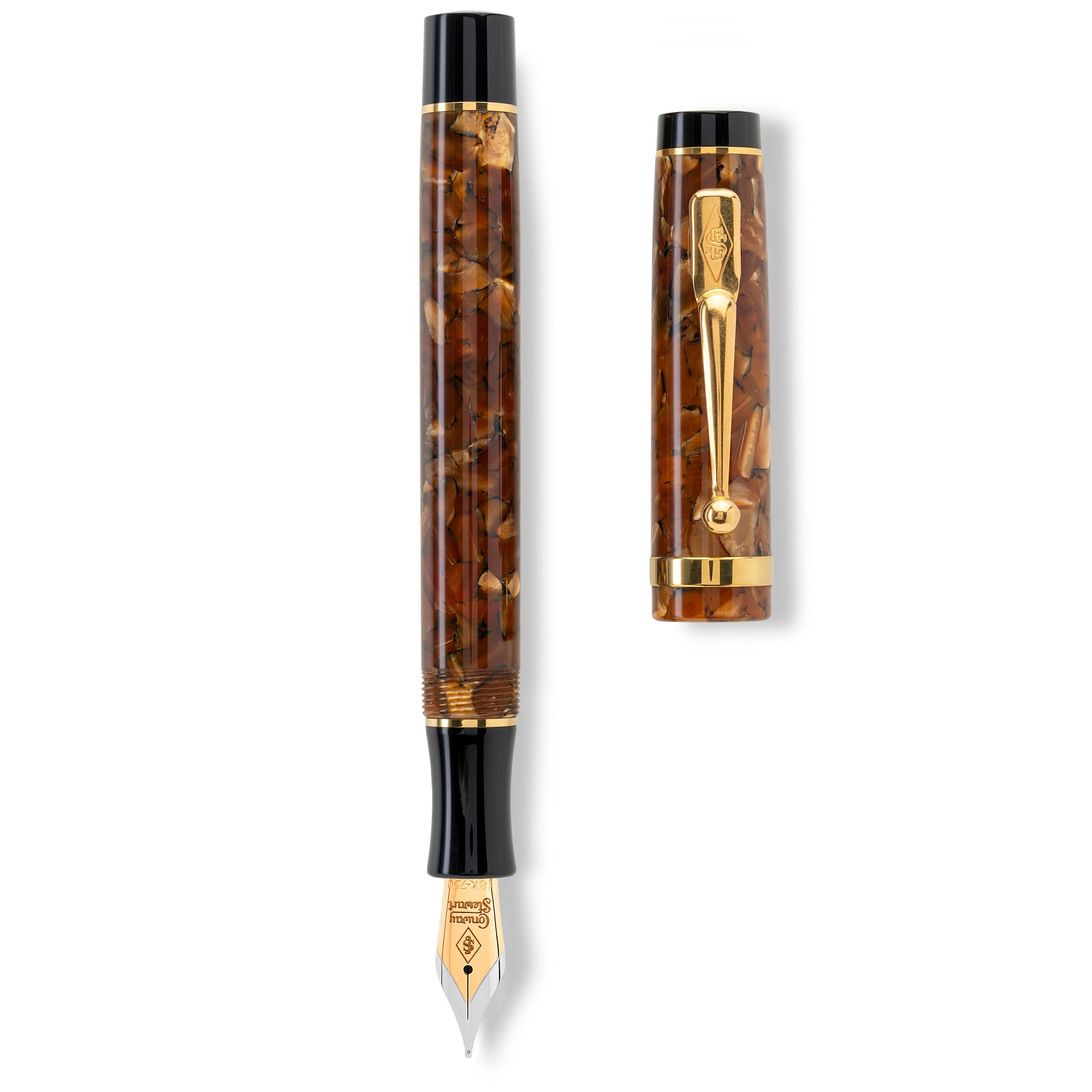 Experience the timeless elegance of the Duro Bronze fountain pen from Conway Stewart. The amber/bronze colour with lighter shades and almost black flecks throughout, perfectly complements the 9ct gold bands that adorn the cap, nib holder, barrel end, and tassie ring. First launched in 1924, the Duro is a classic British pen that boasts a 1920s design, but remains contemporary and relevant today. The iconic Conway Stewart clip and high-density polished black acrylic finish add to its classic look, often referred to as "Bracketed". Each fountain pen comes in an original black leatherette presentation box with a Certificate of Authenticity, User Guide, and anti-tarnish polishing cloth, making it a perfect gift for yourself or a loved one.