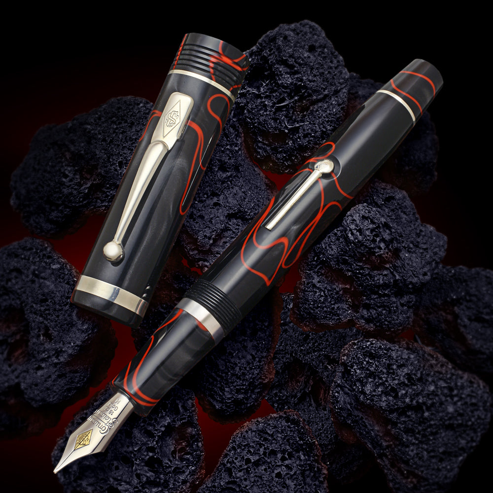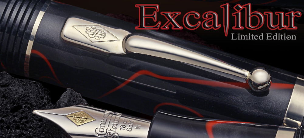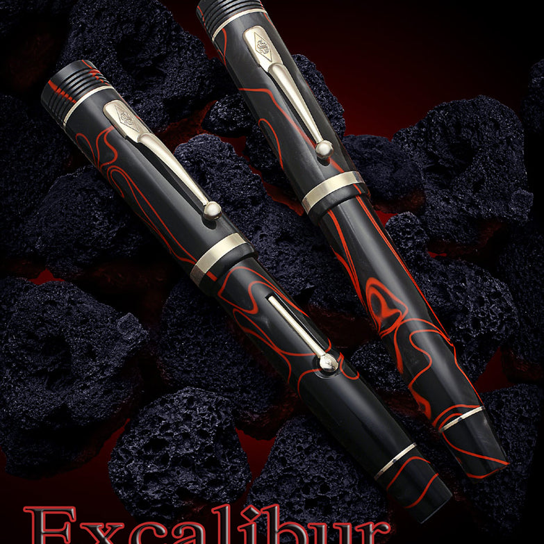 The Churchill Excalibur hand made resin consists of a luxurious mix of rich tones combining a graphite pearlescence backdrop with swirling lines of vibrant red, a bold statement of creativity and individualism. Both eye catching and adventurous, this finish is a hit for those who demand the cutting edge of design. Truly a pen for the passionate lover of fine writing instruments.