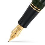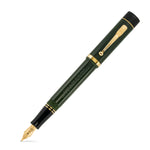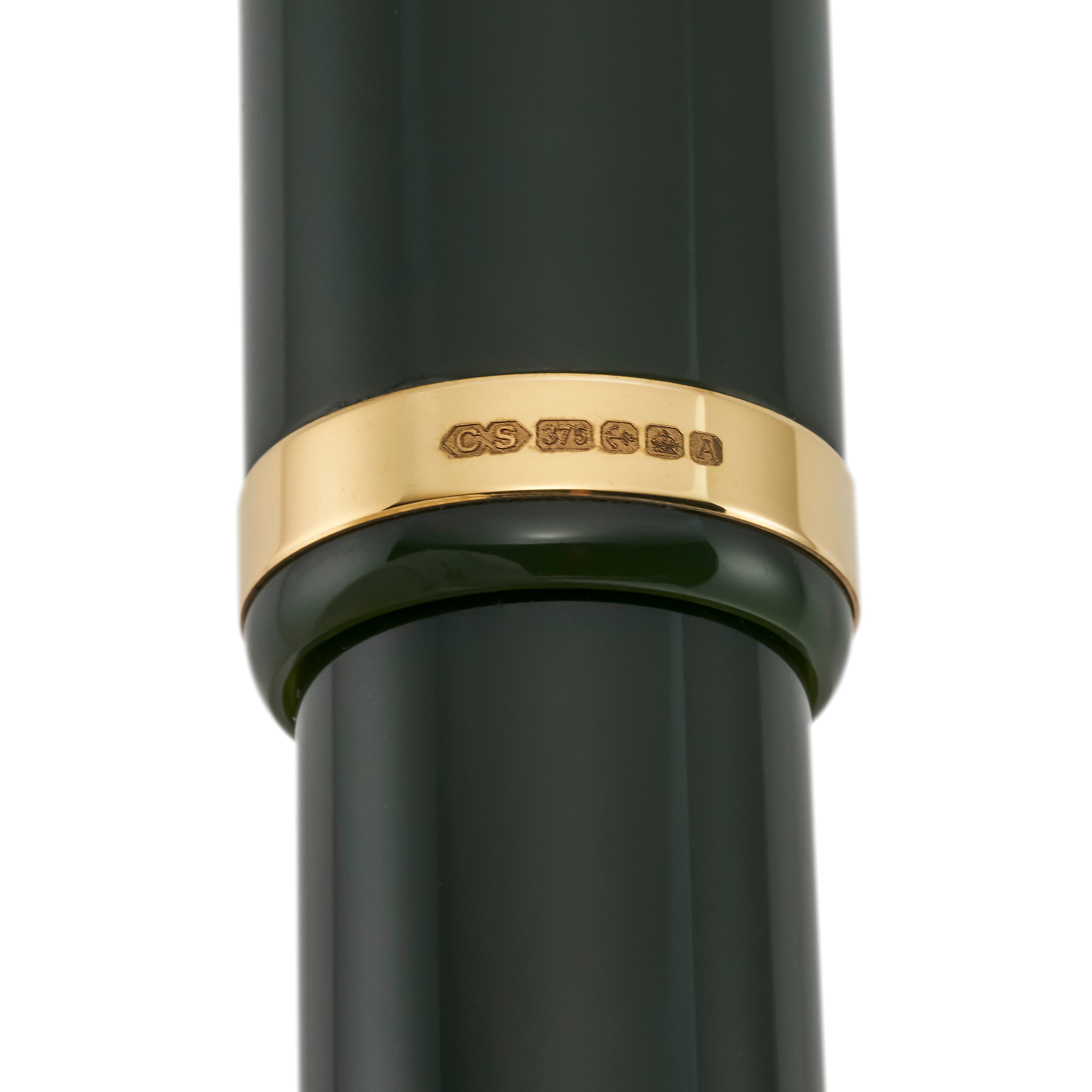 This edition is available in Dark Green & Gold bracketed with black nib-holder, cap tassie and barrel end to give that classical look. It is also available in Classic Black Gold. All fountain pens have 18ct gold nibs fitted. The wide 9ct gold cap band is stamped with the British Hallmarks to show it is genuine gold. There is also included a leaflet that explains the history of British Hallmarks.