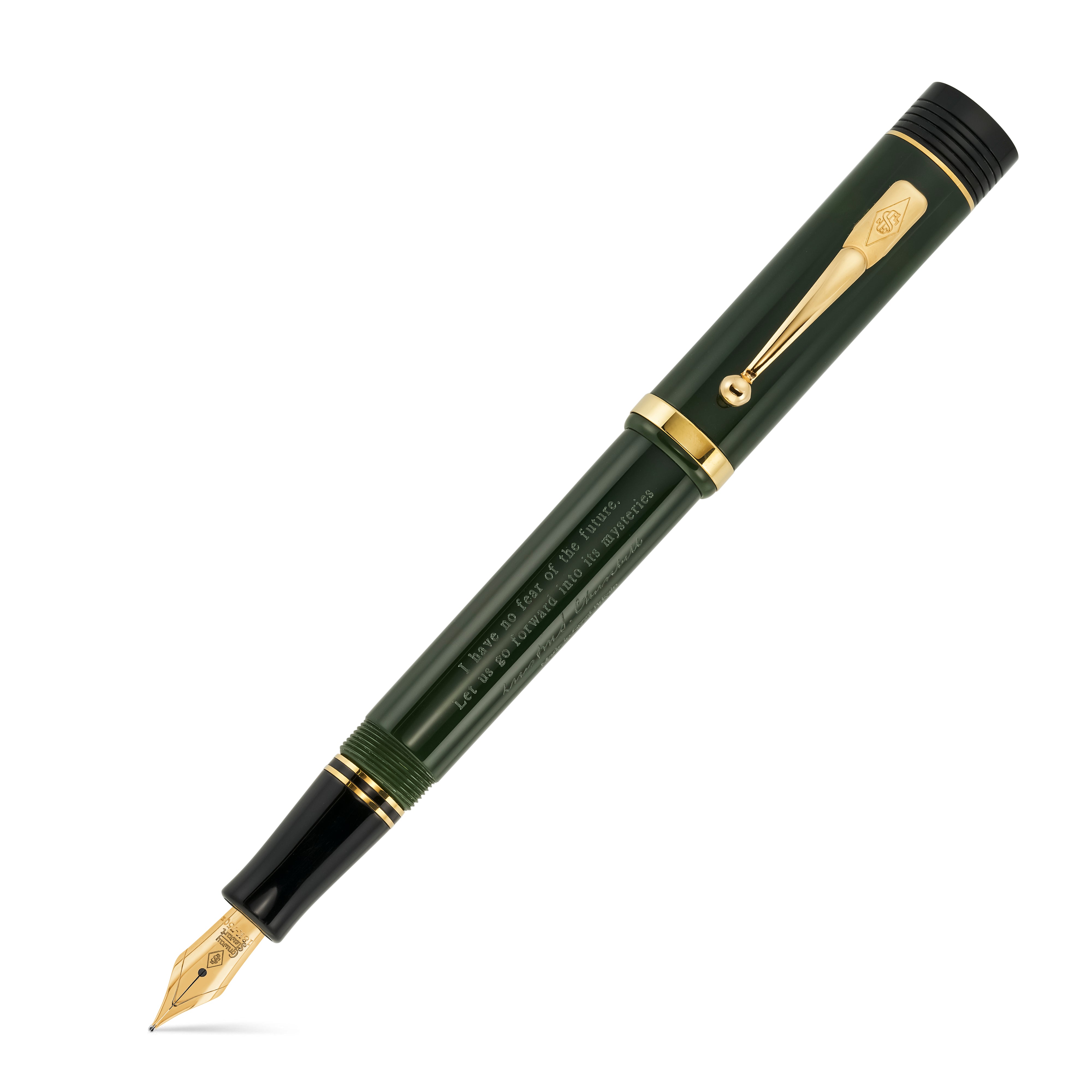 From one of Churchill's speeches made on the 29 September 1943 at the Royal Albert Hall to an audience still in the midst of WWII, these words  “I have nothing to fear of the future. Lets go forward into its mysteries” must have seemed uplifting and are engraved on the barrel. Underneath this is Winston S Churchill’s signature, and under that is the words “Made in Great Britain”.