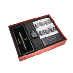 Each pen comes in a replica of one of Winston Churchill’s Red Cabinet Box – these are the brief cases used by ministers of the British Government to carry official papers. On the lid is another of one of his famous quotes “I have always earned my living by my pen”. Inside the box is a foam insert holding a copy of the book “Winston Churchill; Blood, Toil, Tears and Sweat: The Great Speeches” containing many of his famous speeches, and a bottle of green ink. Also included is a facsimile of Churchill’s 1909 letter to his wife showing his actual handwriting and his sketch of the “Pug”.
