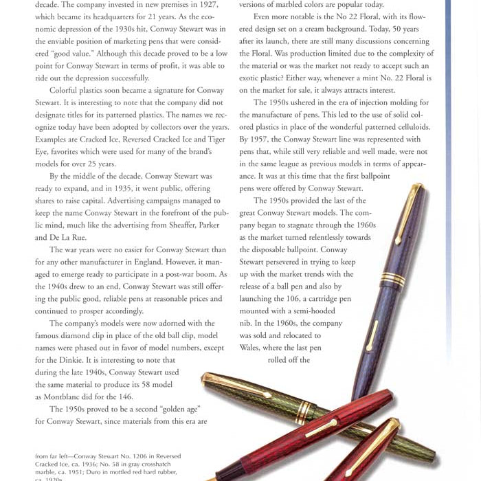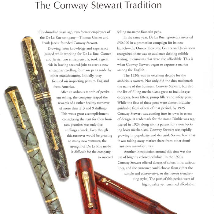 La década de 1920 fue una década excelente para propietarios ambiciosos. El dúo no solo registró el nombre de la empresa, Conway Stewart, sino que también la lista de mecanismos de llenado creció hasta incluir goteros, llenadores de palanca, llenadores de bomba y bolígrafos de seguridad. Si bien la primera de estas plumas era casi indistinguible de otras de ese período, en 1925 Conway Stewart estaba ganando terreno en términos de diseño. En 1924 se registró una marca comercial con el nombre Dinkie junto con una patente para un nuevo mecanismo de palanca de bloqueo. Conway Stewart estaba creciendo rápidamente en popularidad y demanda. Hasta tal punto que estaba quitándole cuota de mercado a otros fabricantes de bolígrafos dominantes. Otra introducción en esta época fue el uso de celuloide de colores brillantes. En la década de 1920, Conway Stewart ofrecía docenas de colores en sus diversas líneas, y el cliente podía elegir entre los estilos simples y conservadores o los más nuevos que marcaban tendencia. Las plumas de esta época eran de alta calidad pero seguían siendo asequibles.