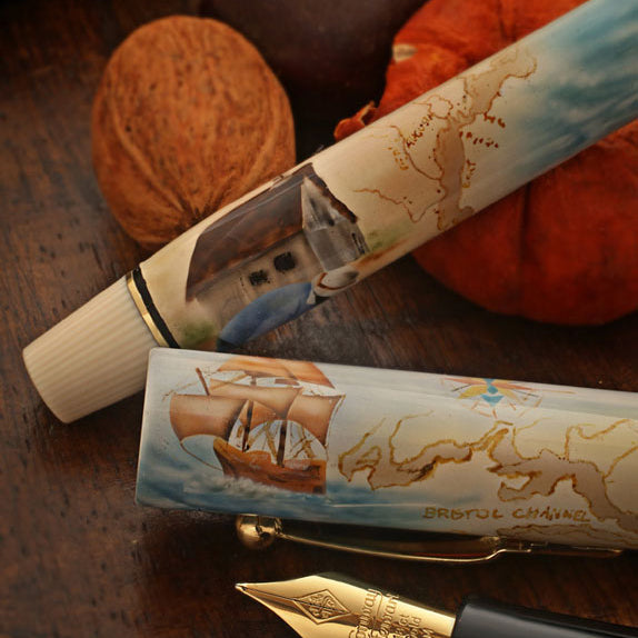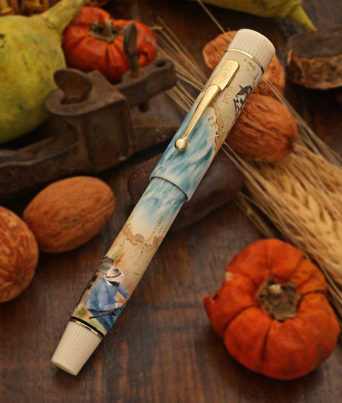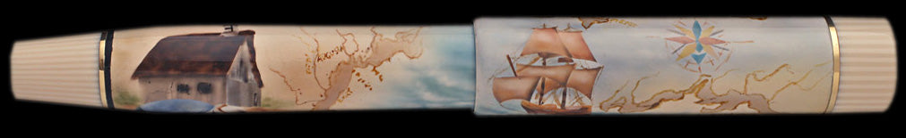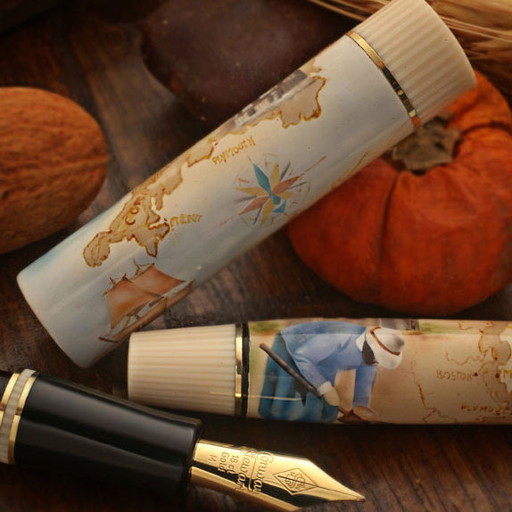 La edición limitada de Conway Stewart Pilgrim se ha creado utilizando el arte del aerógrafo y la pintura a mano para evocar escenas de la historia de los primeros colonos peregrinos.