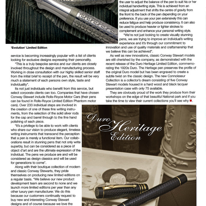 除了新的创新,经典的 Conway Stewart 模型仍然受到公司的珍视,最近发布的 Duro Heritage 限量版就证明了这一点,以纪念 1920 年代的 Duro。 Heritage 钢笔保留了原始 Duro 型号的轮廓,但经过雕刻以在经典设计上创造出微妙的变化。全新的 Connoisseur 系列是收藏家的梦想,由 5 个 Conway Stewart 型号组成,装在硬木和黑漆展示盒中,仅售 75 个。