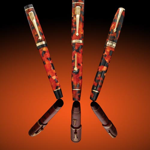 新款 Conway Stewarts 的可用颜色范围从非常简单和低调到直接跳出表壳并吸引您的眼睛的一对。如果您一直觉得现代钢笔的大理石花纹丙烯酸过于保守,我会将您的注意力引向“黄色漩涡”。这是一种明亮的橙色,更亮的黄色线条环绕着整个瓶盖和酒桶。不适合胆小的人,这是一支发表声明的笔!同样,“星云”或“流星”分别是大理石纹的深红色、白色和蓝色,以及红橙色大理石纹。