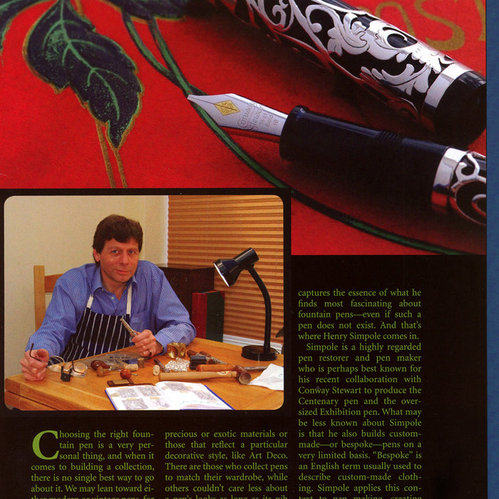 选择合适的钢笔是一件非常个人的事情,在建立收藏时,没有单一的最佳方法。例如,我们可能倾向于现代钢笔或复古钢笔,或者专注于具有历史意义或具有不寻常特征的钢笔。有些人喜欢由珍贵或异国情调的材料制成的钢笔,或者那些反映特定装饰风格(如装饰艺术)的钢笔。有些人收集钢笔是为了搭配自己的衣柜,而另一些人则不在乎钢笔的外观,只要笔尖符合他们的完美标准即可。无论倾向如何,真正的收藏家总是在寻找一支能够捕捉到他认为钢笔最迷人的精髓的钢笔——即使这样的钢笔并不存在。这就是亨利·辛波尔的用武之地。