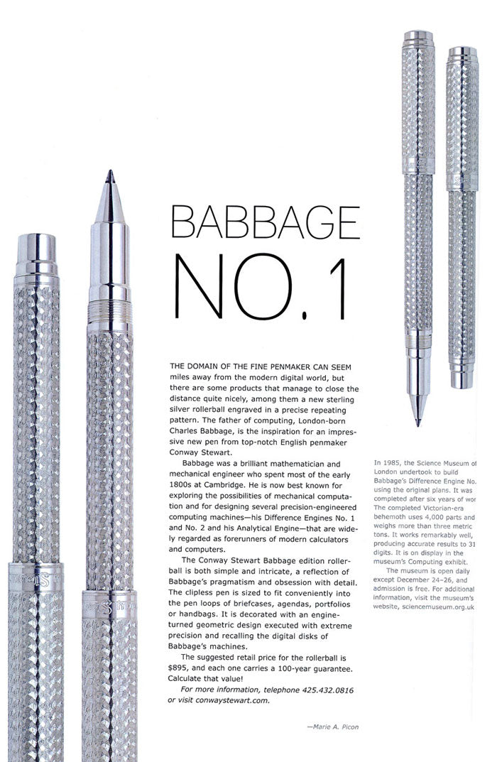 Conway Stewart Babbage 版滚球既简单又复杂,反映了 Babbage 的实用主义和对细节的痴迷。无夹笔的尺寸可以方便地放入公文包、议程、公文包或手提包的笔环中。它装饰有引擎转动的几何设计,执行极其精确,让人想起巴贝奇机器的数字磁盘。