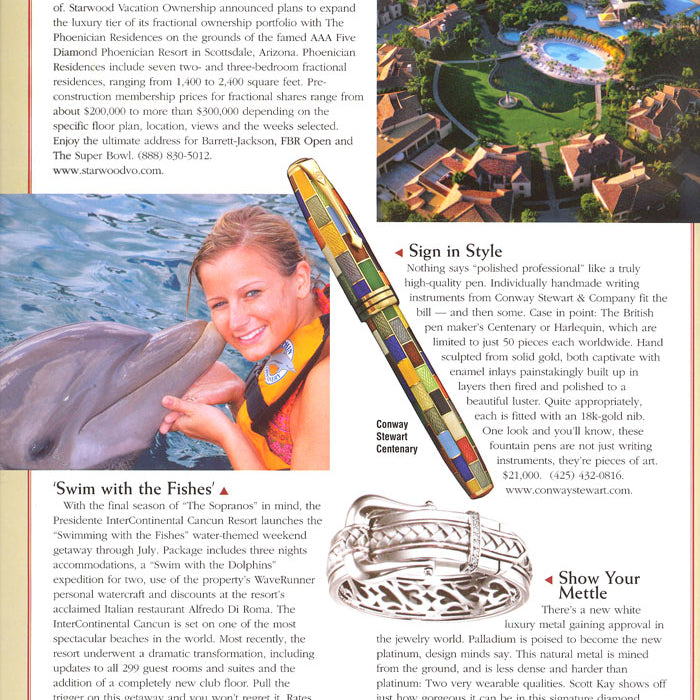 没有什么比一支真正高品质的笔更能体现“精致的专业”。 Conway Stewart & Company 单独手工制作的书写工具符合要求——而且还有一些。例证:英国钢笔制造商的 Centenary 或 Harlequin,全球限量 50 支。由纯金手工雕刻而成,两者均以珐琅镶嵌物精心打造,层层叠叠,然后烧制并抛光至美丽的光泽。非常恰当地,每个都配有 18k 金笔尖。一看就知道,这些钢笔不仅仅是书写工具,还是艺术品。 21,000 美元。 (425) 432-0816。 www.conwaystewart.com。